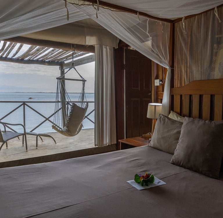 Amid the island's lush greenery, the lodge provides enticing barefoot luxury with safari tents and secluded chalets along a palm-lined beach.